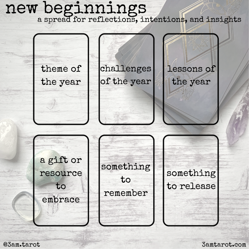 my new spread is one that was written for this present moment, but it’s one that i hope will be useful any time you’re approaching a new beginning. birthdays, anniversaries, important dates that you honor regularly - this spread can easily be tweaked or adjusted to meet your needs, giving you an opportunity to look at where you’ve been and where you’re going, to find lessons, to respect challenges. and while i wrote this with the intention of using it at the top of a new year, you could also adjust it to be a monthly or even weekly check-in spread, giving yourself consistent moments for stillness, contemplation, and acknowledgement.