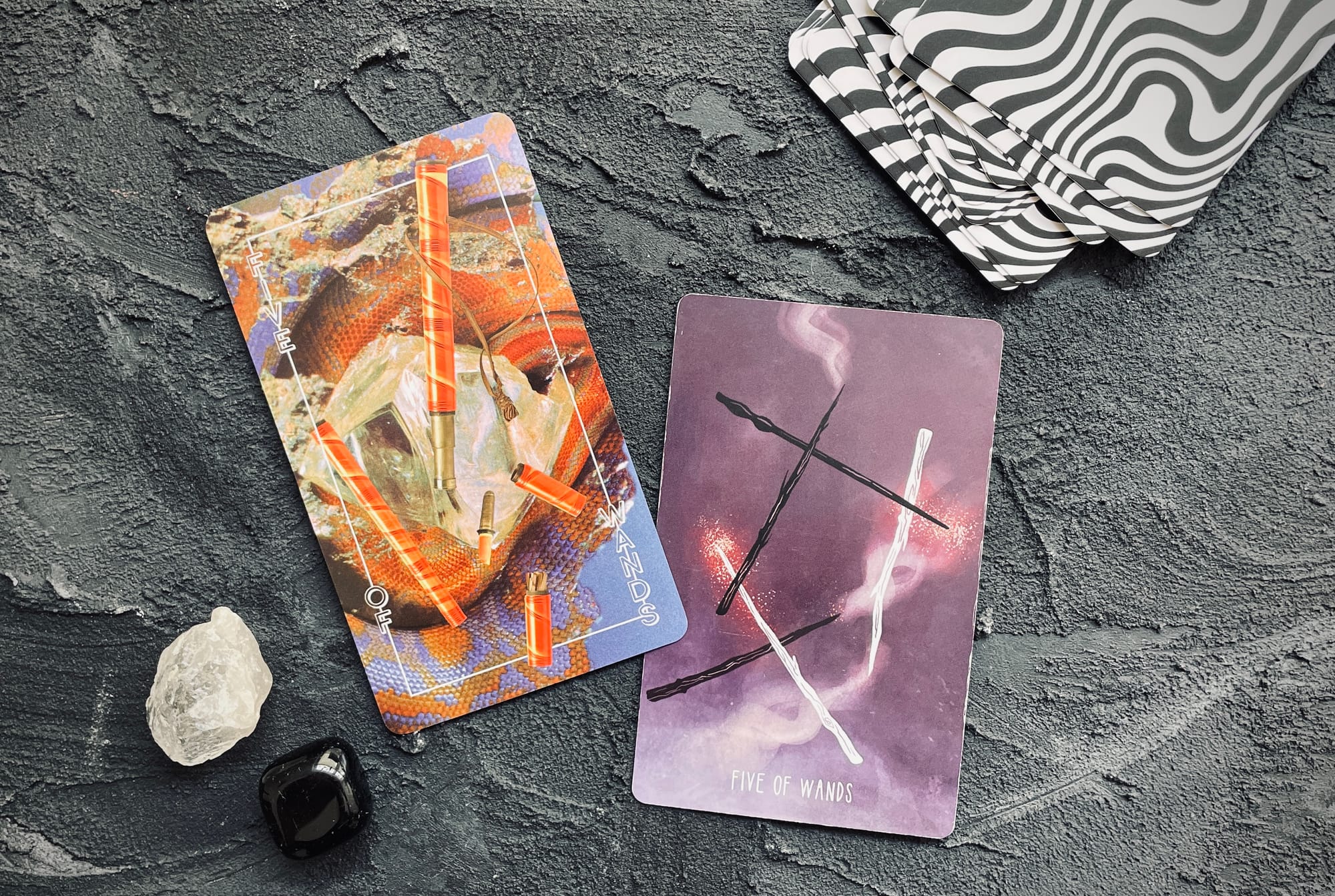 we've already looked at our card of the month, the five of wands, through a general lens as well as a numerological one. but sometimes, the best way to engage with a tarot card, especially one as potentially prickly but powerfully present as the five of wands, is to grab our deck and get to work.