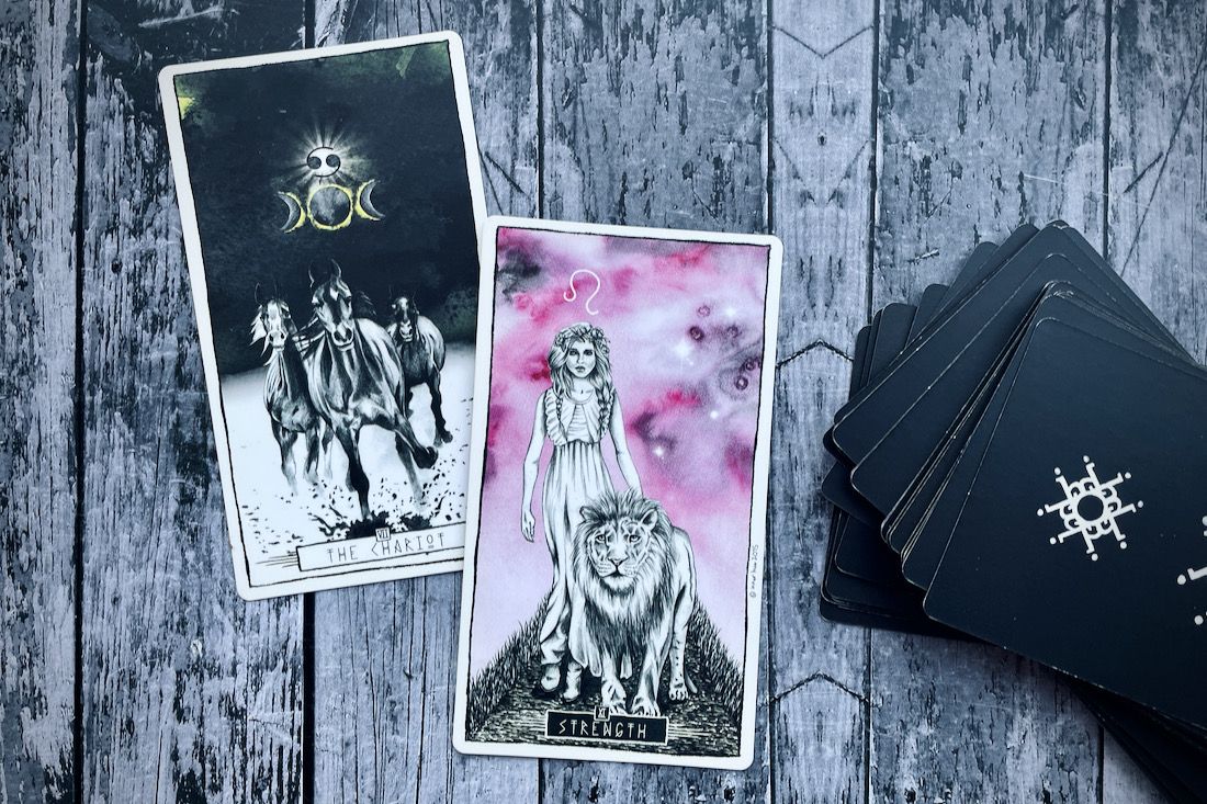 in the major arcana, the shift from cancer to leo is the shift from the chariot to strength. the chariot is our archetype of determination and focus, of recognizing which boundaries are protecting us and which are holding us back. it’s about asking ourselves the hard questions, identifying what we want to pursue, recognizing what really matters to us and committing to chasing after it with everything that we have. and strength, the next card in the sequence, is about going after that goal, putting all of our power and magic and intention into making those big dreams come true. it requires balance, restraint, an honest and clear understanding of our skills.