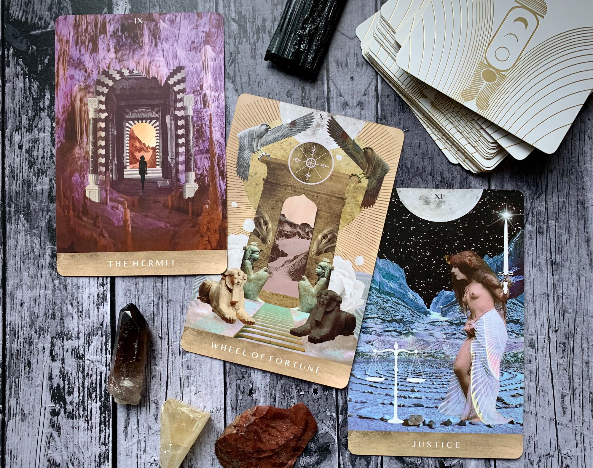 what card actually sits in this space between, and what does it have to teach us? with only twelve zodiac signs and twenty-two cards within the major arcana, there are ten archetypes that i don’t write about as frequently, that i don’t always get the opportunity to dive deep with. and for many readers, the wheel of fortune tends to be an elusive one, a card of luck and karma, fortune and fate, change and constancy. after sitting with the reflective awareness of the hermit, giving ourselves the space to get to know ourselves in new and more profound ways, the wheel of fortune reminds us that the world does not stop turning simply because we have left our routines behind for a time. opportunities and possibilities abound, potential is everywhere, and for every choice we make, every door we open, another one closes behind us.