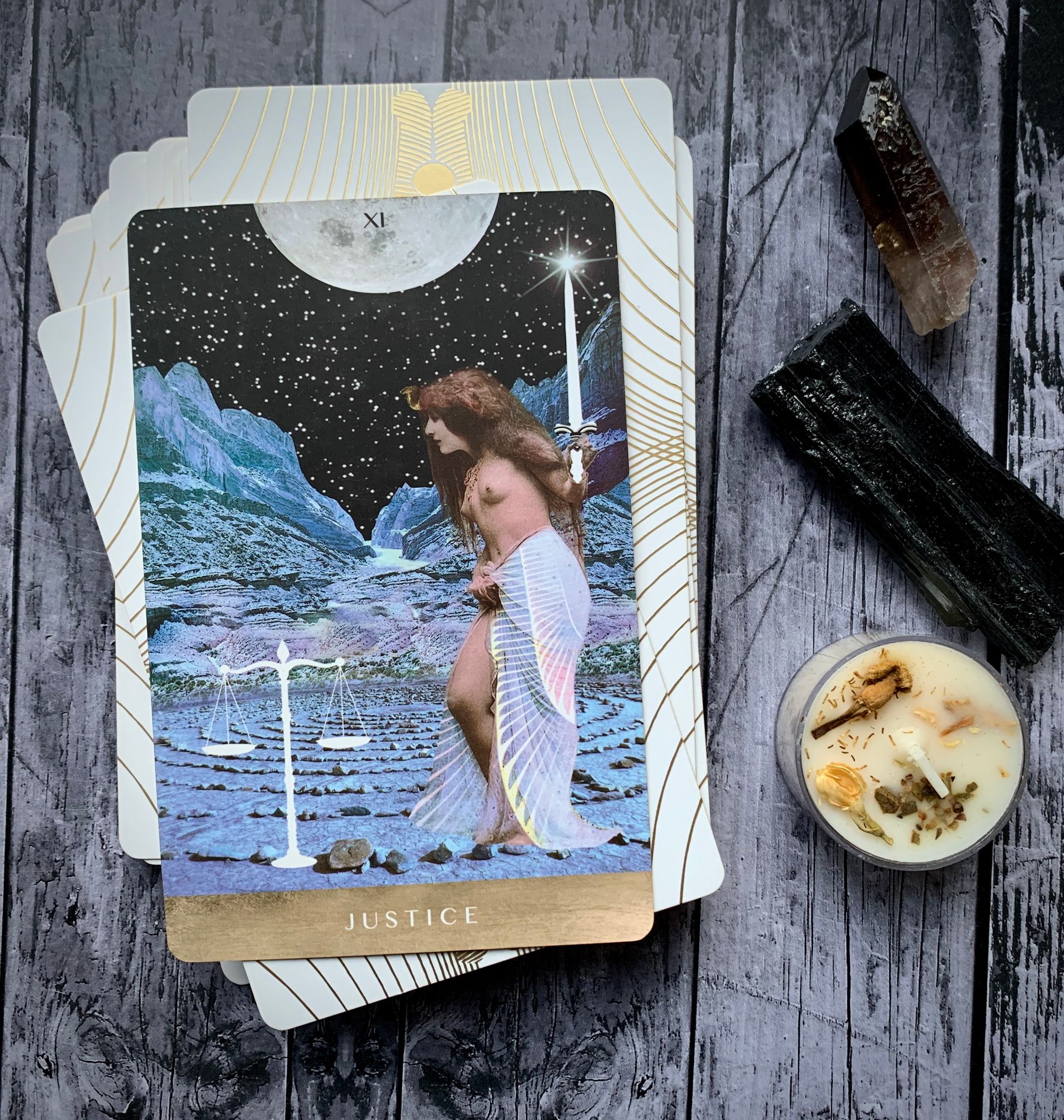 the shift from the hermit through the wheel of fortune and into justice is one of self-awareness and deep personal discovery. we’re asked to take ownership of our wants and our choices, to recognize what we can control and all that we cannot change. the world keeps turning, whether we are quietly examining our shadows or eagerly sharing ideas with those around us. seasons shift, things die and are reborn, the days grow shorter and then longer again. we live in cycles, patterns, habits. and while some are beyond our ability to change, others are breakable, flexible. after we know what matters to us, after we recognize our power, justice allows us to step into the world with a clear vision and a willingness to listen. and with today’s shift into libra, we have an opportunity to learn from those around us, to allow ourselves to grow into people that can balance humility and pride, knowledge and expansion.