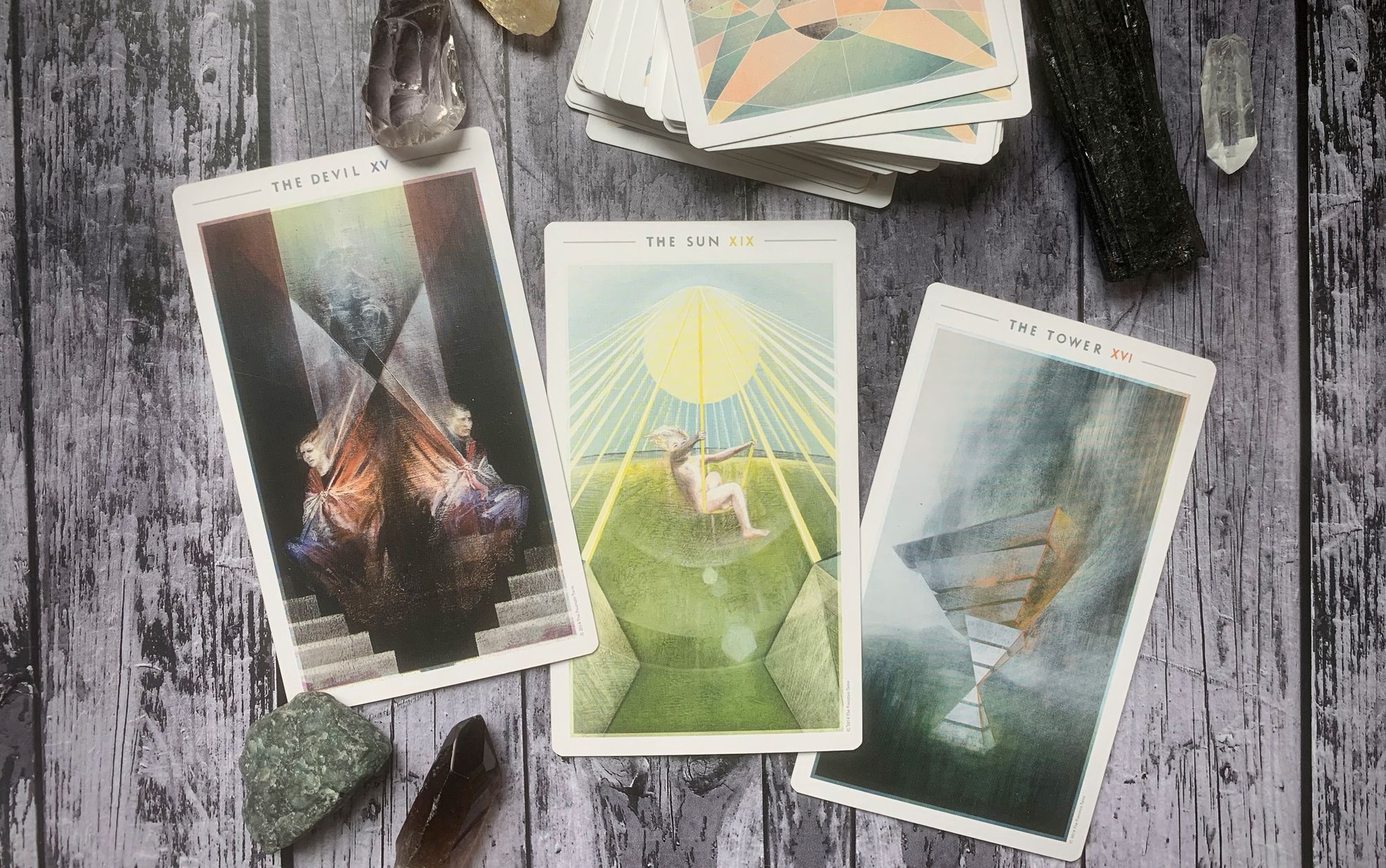 these three archetypes together push us to seek truth, to examine what makes us feel safe and where we need to dig deeper. the devil challenges, the tower destroys, the sun clarifies, and each card reveals and expands boundaries, asking us to push hard and acknowledge what is real, considering where we might be deceiving ourselves. this is a time of tackling obstacles, celebrating accomplishments, and establishing security, recognizing the ways that we make progress as well as learn from our mistakes. what is being revealed, broken, rebuilt? what patterns of destruction need to be acknowledged and abandoned? what shadows are being explored, and what are you learning through this process of uncovering? what does capricorn teach us about what we value, where we find power, how we navigate control? how does cancer help us protect ourselves, be sensitive and caring, honor our intuition?
