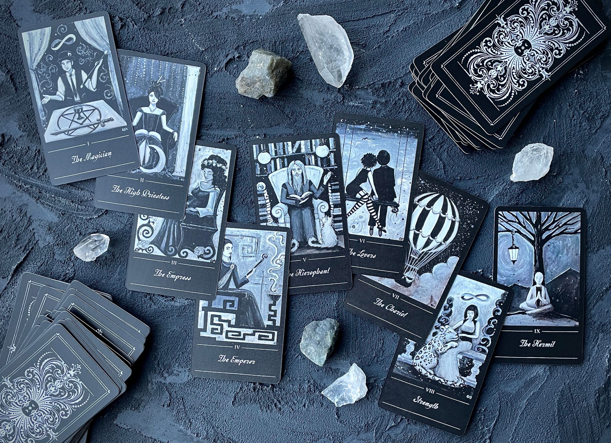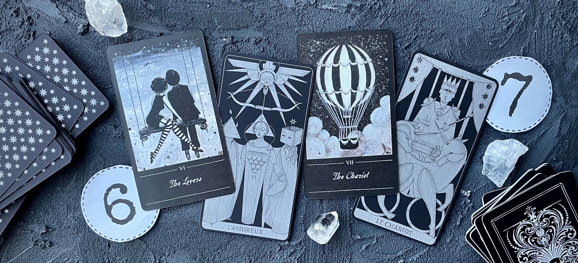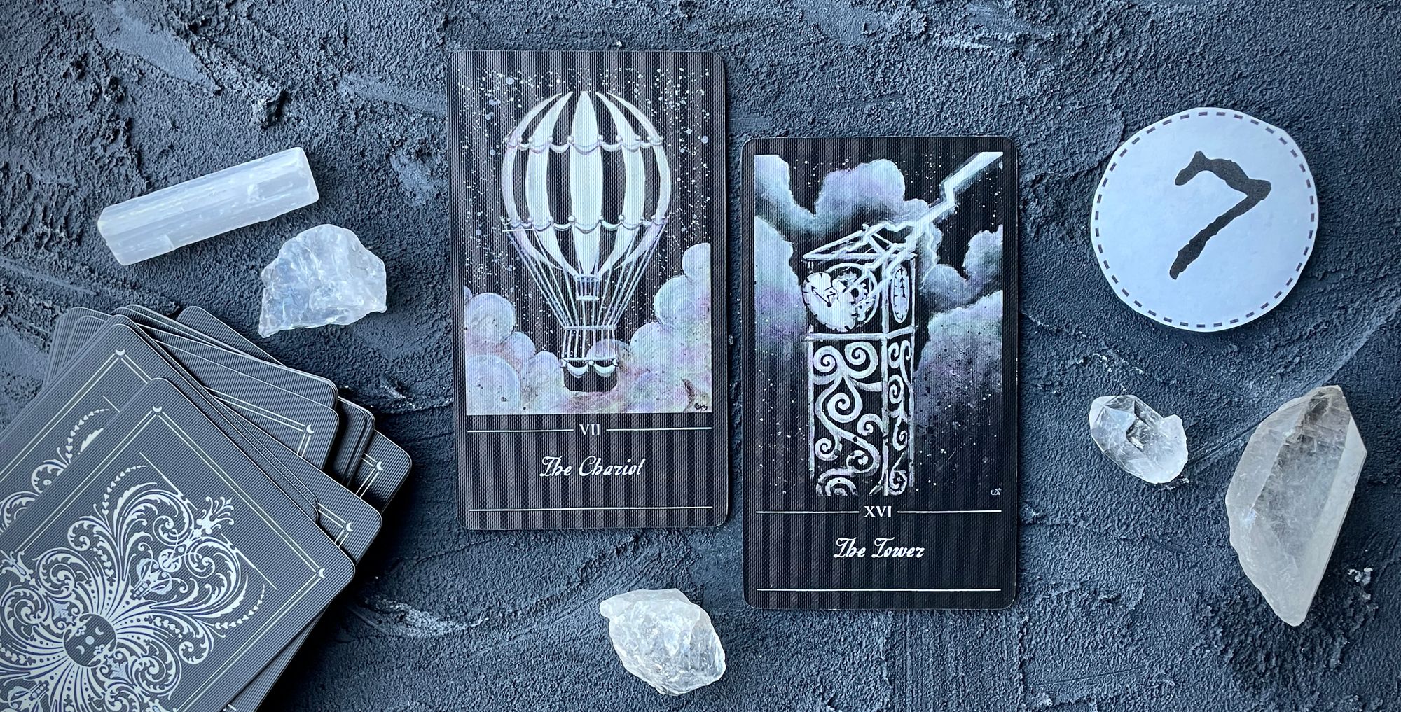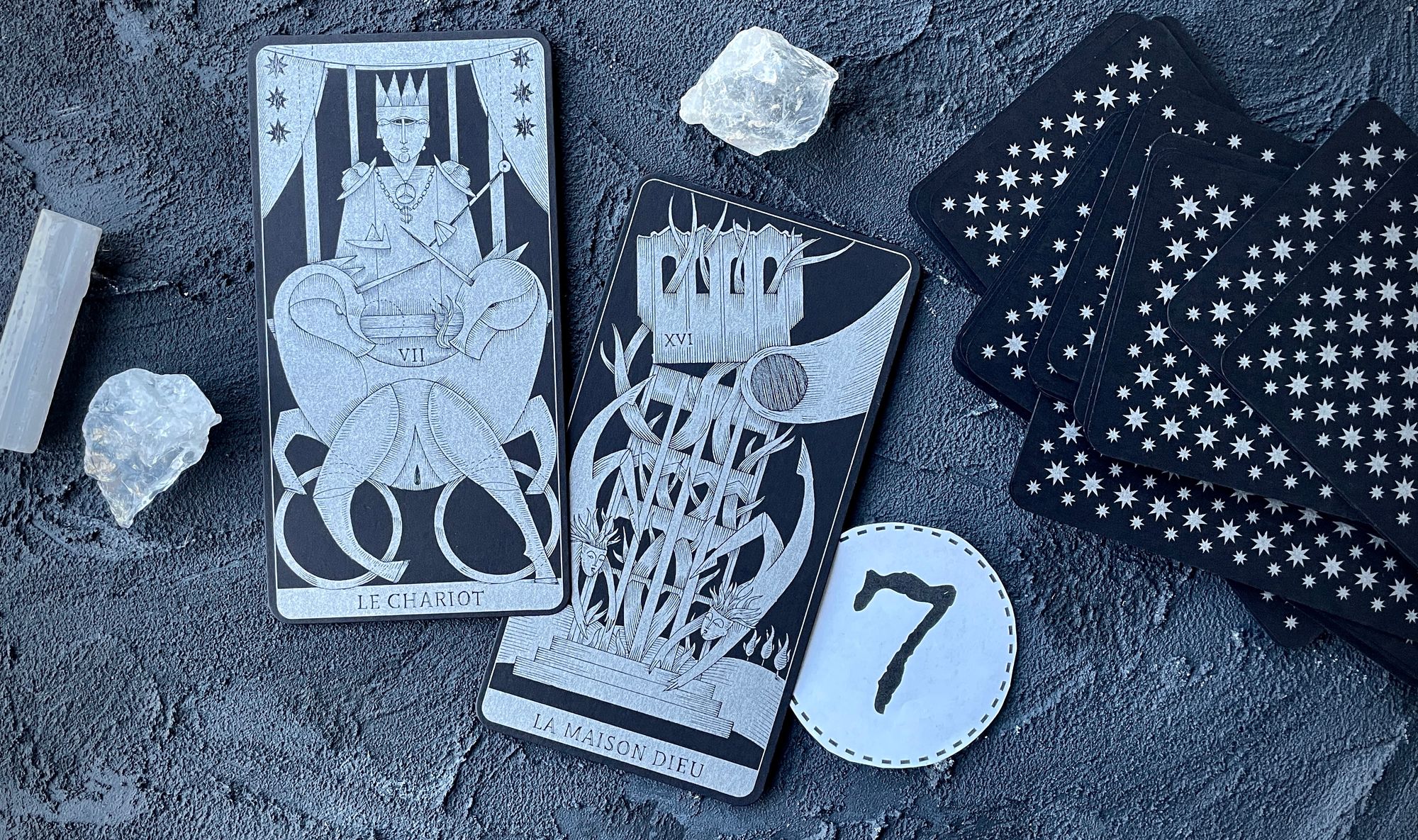 think about the two major arcana archetypes that fit into this tarot constellation: the chariot (card 7) and the tower (card 16 / 1+6 = 7). both of these archetypes explore control, boundaries, and movement, but in different ways. they long for authenticity and truth, need to understand what drives us forward or up or down, require depth and purpose in everything they do — and they aren't afraid to make dramatic changes or permanent shifts in order to facilitate growth. in the same way, minor arcana sevens are often cards of assessment and adjustment, as we consider what we know and what we don't, honor what we have, and recognize where we may need to make changes in order to reach our ultimate goals.
