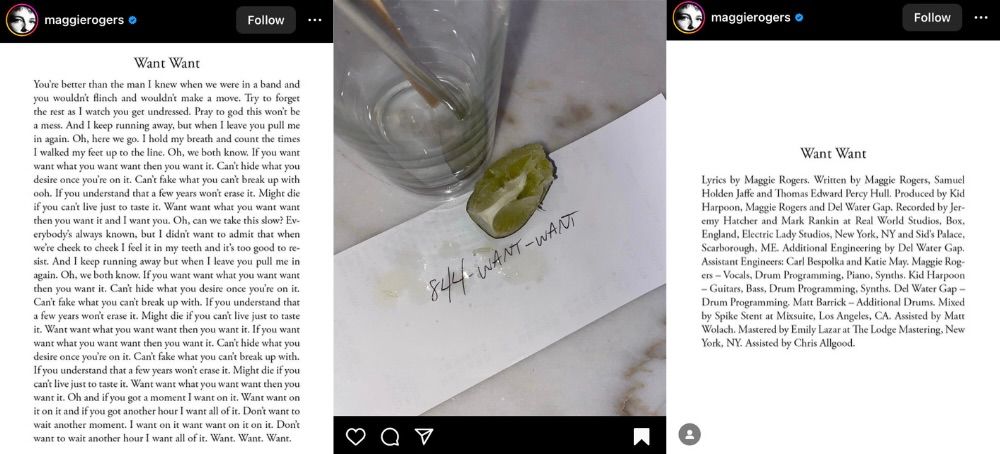 at its simplest, this whole album is about different kinds of desire. but want want off of maggie rogers' 2022 release surrender is a particularly perfect song for a need you feel deep in your bones, when you want something desperately enough that you just keep coming back to it no matter what you do, where you go, who you become, how you change, whatever else you might find or achieve or complete.