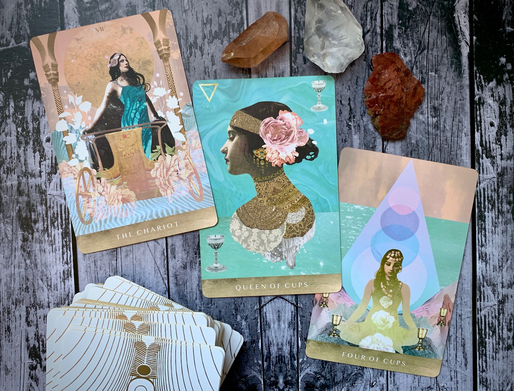 although the chariot is the main tarot card associated with cancer, within the minor arcana we also see cancer in the psychic and empathic queen of cups, a figure of nurturing and strength. this ruler teaches us to prioritize compassion and sensitivity, to care for ourselves with the same devotion and kindness that we offer to others. and in the pips, we find cancer’s energy in the four of cups, balancing boundaries with community. it can be challenging to protect ourselves without going overboard, to honor our own needs while still staying connected to those we love - and in cancer, we see a desire for privacy and the comfort and safety of home pushing against personal walls or worries. it’s possible to pursue our dreams and build our communities while also giving ourselves space to process and heal, but it must be done with intention, or we can easily find ourselves isolated or stagnant.