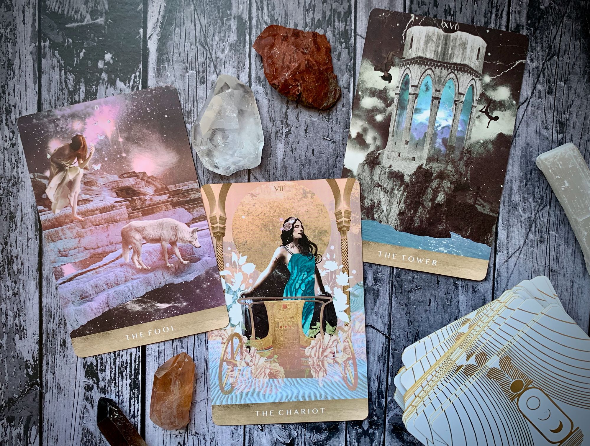 as a trio, these archetypes explore different kinds of movement. the fool is eager and naive, may be courageous but has no idea where they are going, is relying fully on intuition and faith in the universe to help them forward. the chariot is fast and powerful, with a plan, a route, a destination, as well as a safe place to recover once the race has been won. and the tower is a quick and chaotic free-fall, a breaking down of the old to make space for the new. all of this movement brings new freedom, either in breaking out of old patterns or in racing towards a carefully chosen destination. and in looking at these cards together, we see deliberate change, intentional evolution, a desire and need for transformation. how can we balance thoughtful action with open shifts? what are we holding on to, and where do we need to let go? how can we move with purpose and focus? when might we need to slow down and consider where we’re going? and where might taking a risk help us find a new perspective on our future?