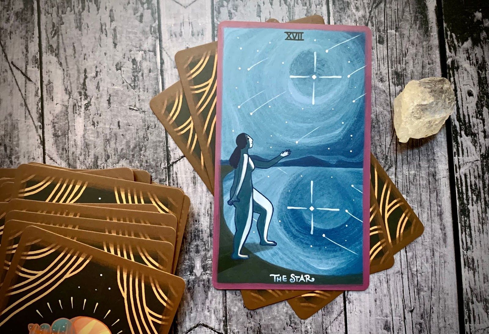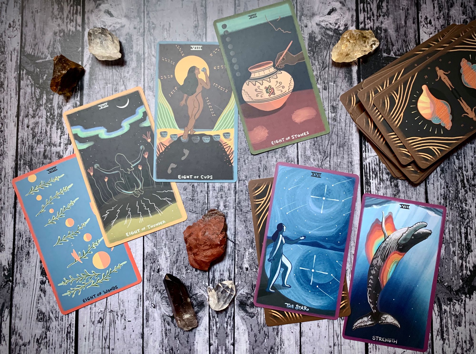 numerologically, the star doesn’t have quite as clean of a parallel as the other two archetypes - but in combining the star’s digits of one and seven, we get eight, pointing us back to strength and the minor arcana’s eights. all of these cards offer us hope, with the eight of wands celebrating joyful and obstructed movement, the eight of pentacles urging us to keep growing our skill and craftsmanship, and the eight of cups giving us permission to walk away from something harmful or destructive. even the eight of swords, though it explores the ways that we get trapped in our own negative thought patterns, reminds us that things are not as bad as they seem, that we can find our way out if we simply shift our perspective.