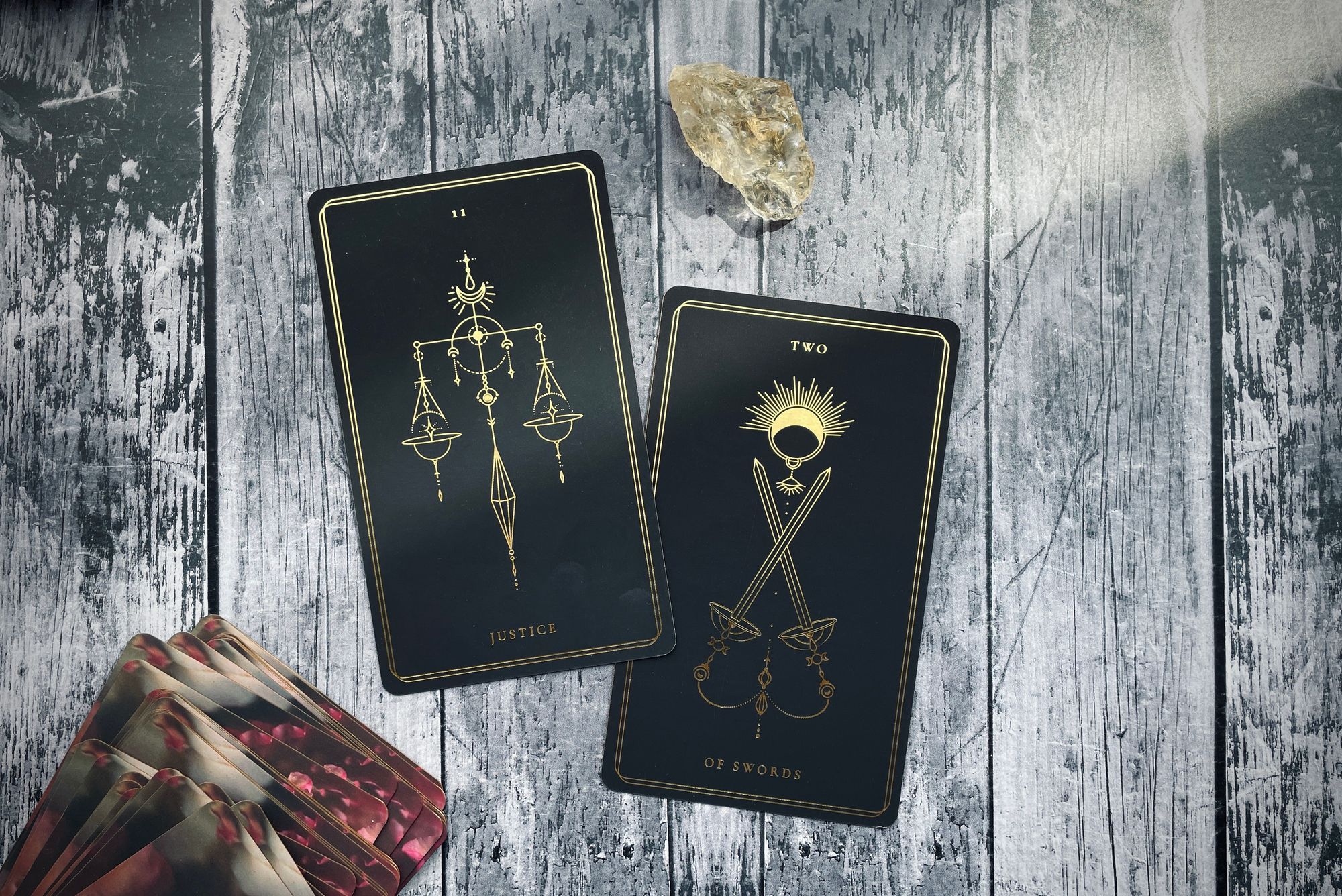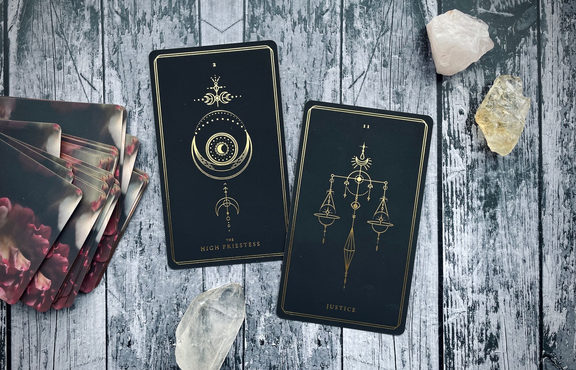 justice is card eleven in the major arcana, which in pythagorean numerology we reduce down to two (1+1 = 2). and while the number two holds a lot of fascinating properties, while its energy can move in a variety of directions and destinations, two in tarot most directly points us back to that archetype of choice and observation, balance and intentionality, space and certainty: the priestess.
