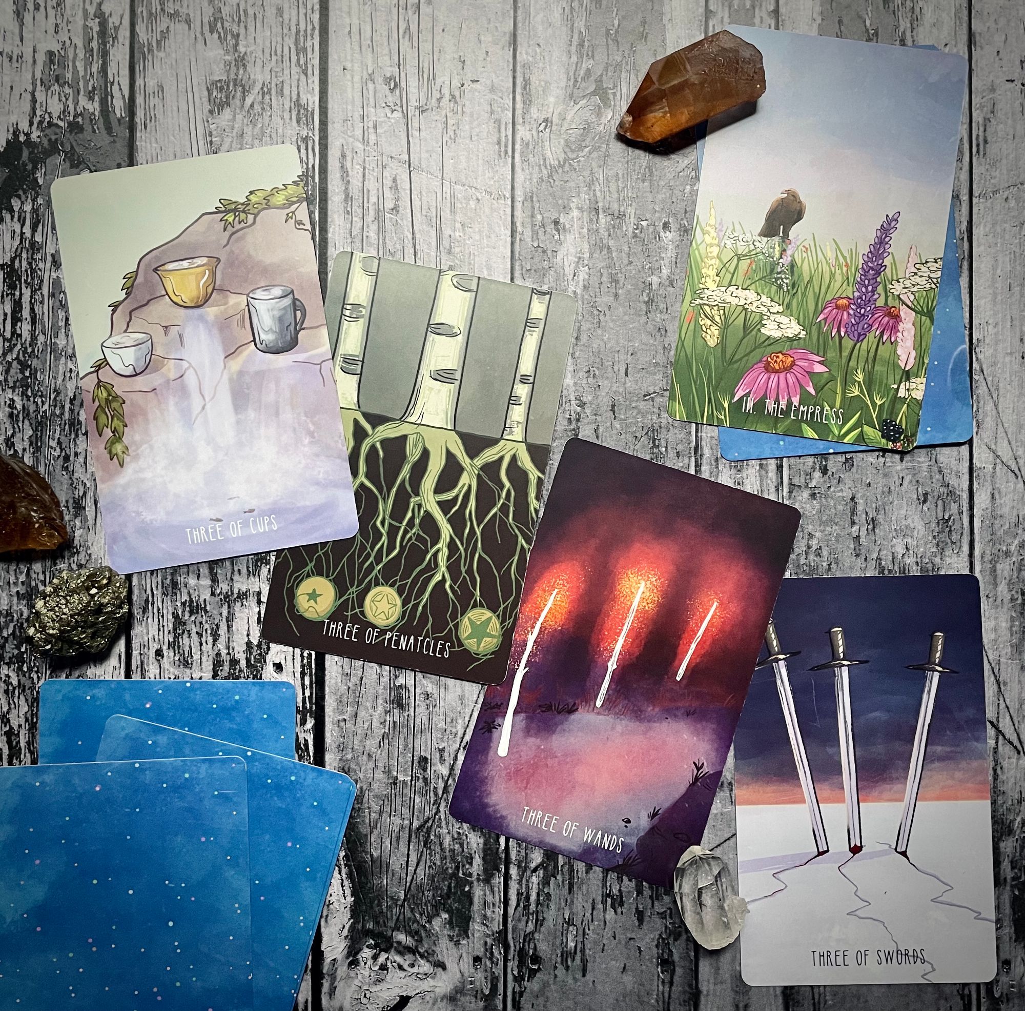 we see this same spirit echoed in the threes of each suit: fire expanding, water overflowing, air sharpening, earth sprouting. as our energy unfurls, as our community finds us, those tiny, wondrous seeds of potential spread like dandelions in the wind, catching the breeze and sharing our wonder, our power, our magic with the world around us. everything that is beginning in these cards keeps building momentum and purpose and clarity: nothing else can happen without these first steps.