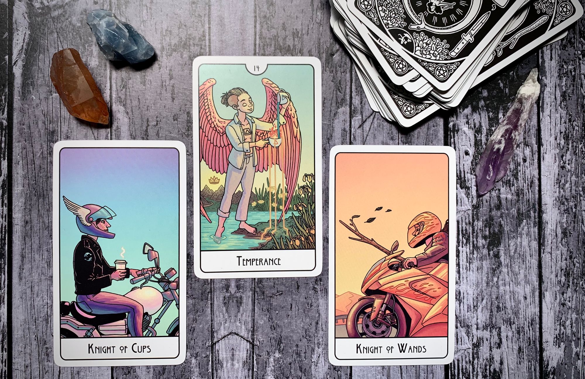 unfortunately, sometimes balance is impossible. we want to explore and also feel safe, to let our winds blow and fires rage even while the ground stays steady beneath our feet. in the this might hurt tarot deck by isabella rotman, the knights all ride motorcycles, sleek machines snarling with power, fast and agile and so easy to lose control of. in reveling in the magic of one singular element, it’s tempting to leave the others behind, to get lost in the heat and the speed, to turn too quickly and crash hard before we can even register what has happened.