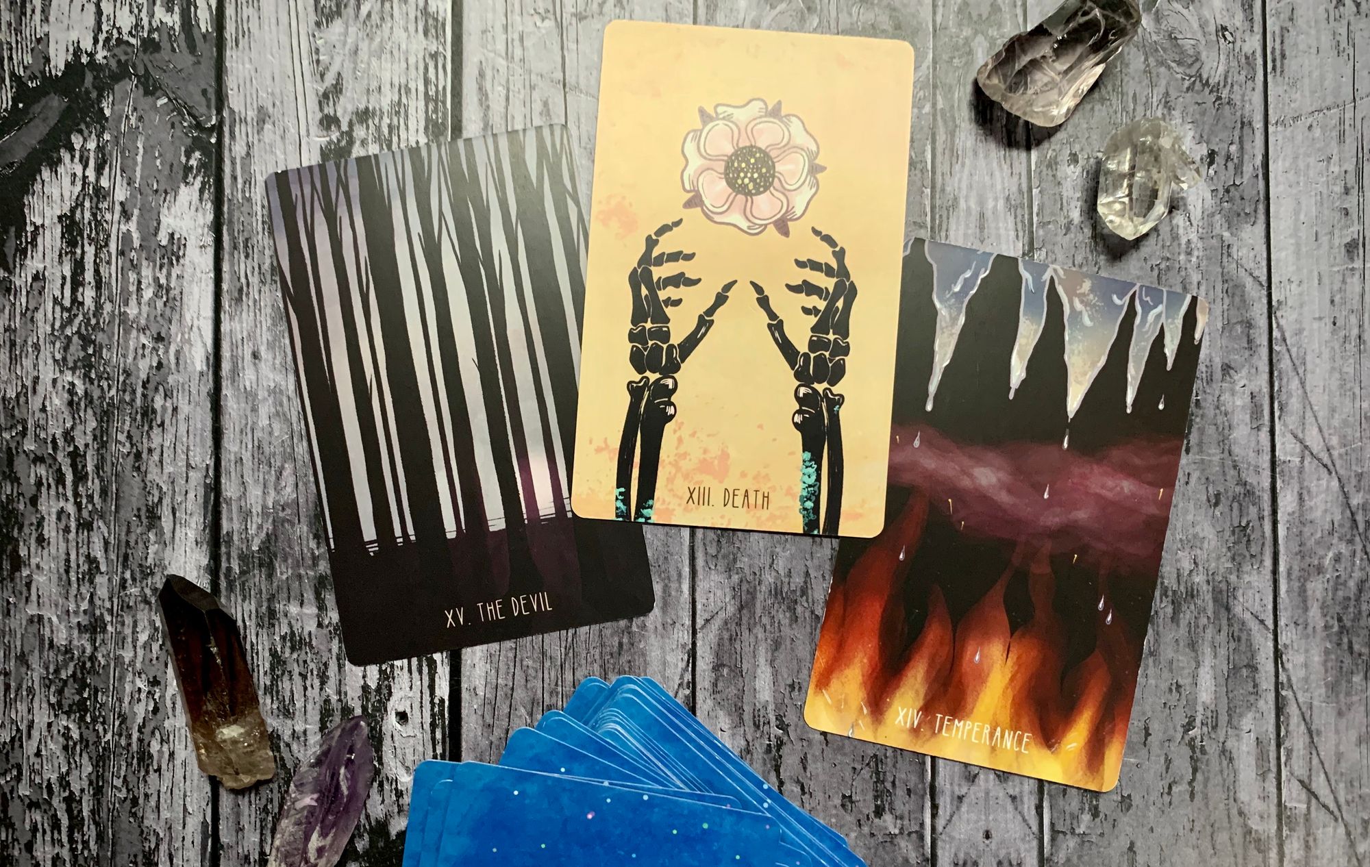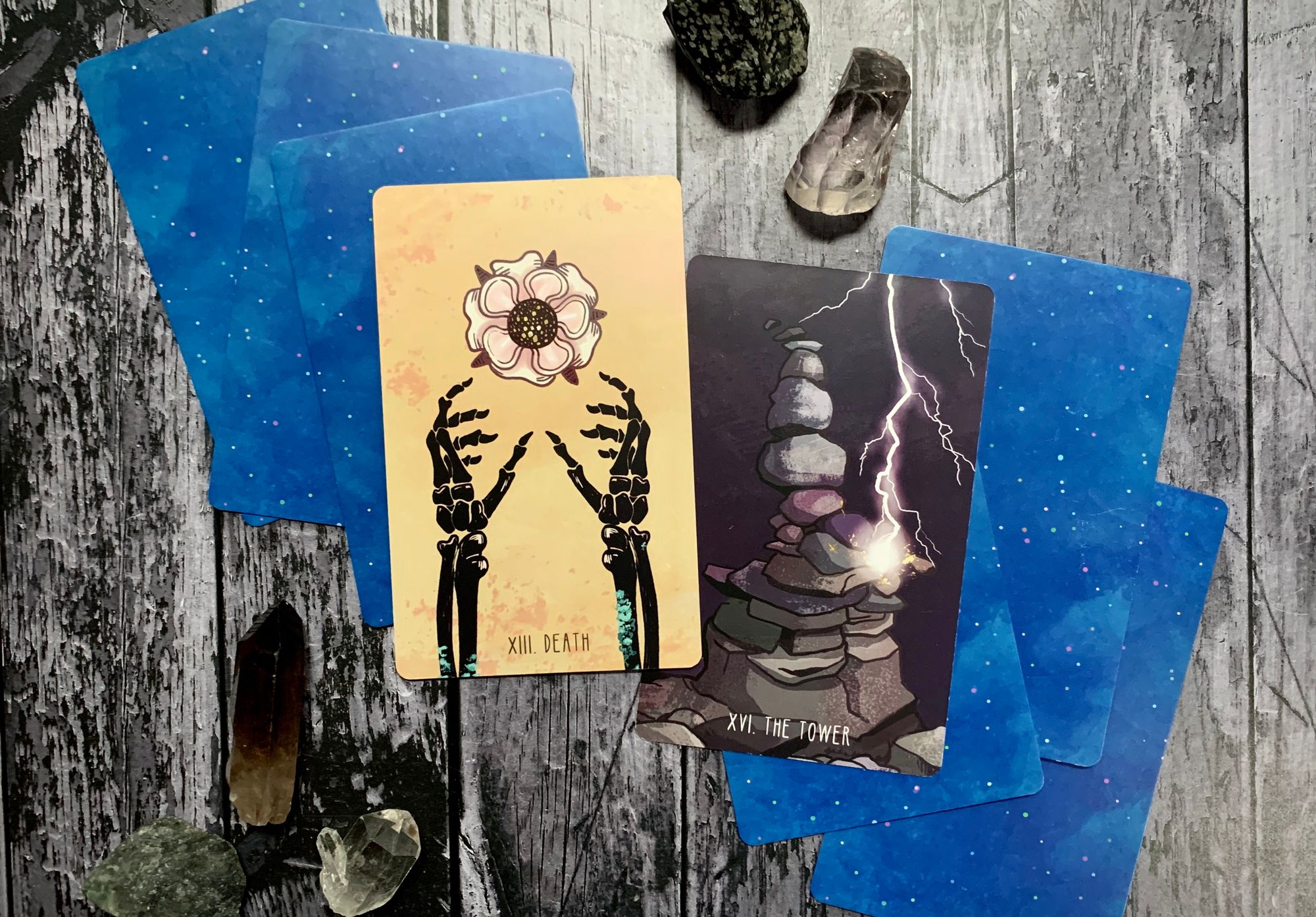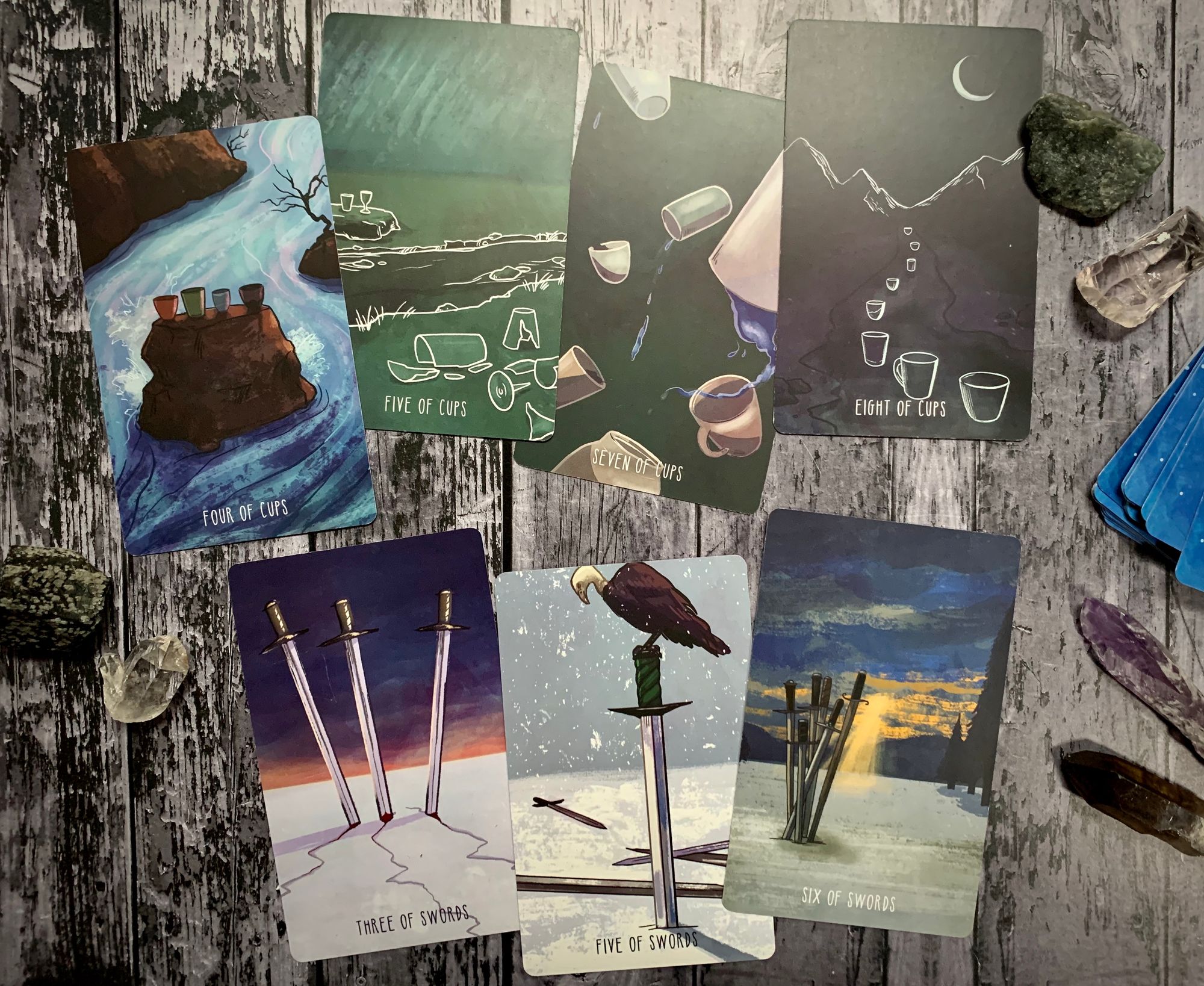 the tarot offers cards that explore this idea from multiple perspectives. major arcana archetypes like death and the tower make space for natural endings and sudden loss, for transitions, for inevitable change and release - and while these are sometimes shifts that we can see coming, they are often unavoidable, something that happens that we are forced to deal with and evolve through. but minor arcana cards like the six of swords and the eight of cups encourage deliberate movement in the face of pain, urging us to take control of the narrative and leave something behind rather than simply react to a loss. while these minor cards have plenty of meaning on their own, tarot is all about cycles, stories, journeys. in all of these cases, it’s important to note what comes before, to consider how these cards contribute to the larger narrative.