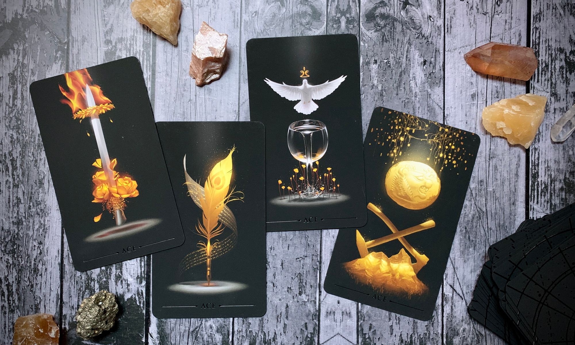 across all of these cards, we see the same kind of drive and purpose: anticipation, joy, uncertainty. there’s a craving to create something, to embrace change, to see the potential ahead even if we aren’t completely sure what shape it will take. the fool may know what their dream is, may recognize how that dream will impact every part of their life, but they don’t necessarily know precisely how they will reach that goal. the aces give us the tools to begin a new cycle, the flickers of insight and inspiration that we need to get started, but they won’t do the work for us. all of these cards offer beginnings in and of themselves, but they also make space for more, urging us to peer deeper into the void, to let ourselves experiment and play, to see what happens when we make space for options. they represent the opening of a door, but we still have to decide when and how to walk through it, and what we will do on the other side.
