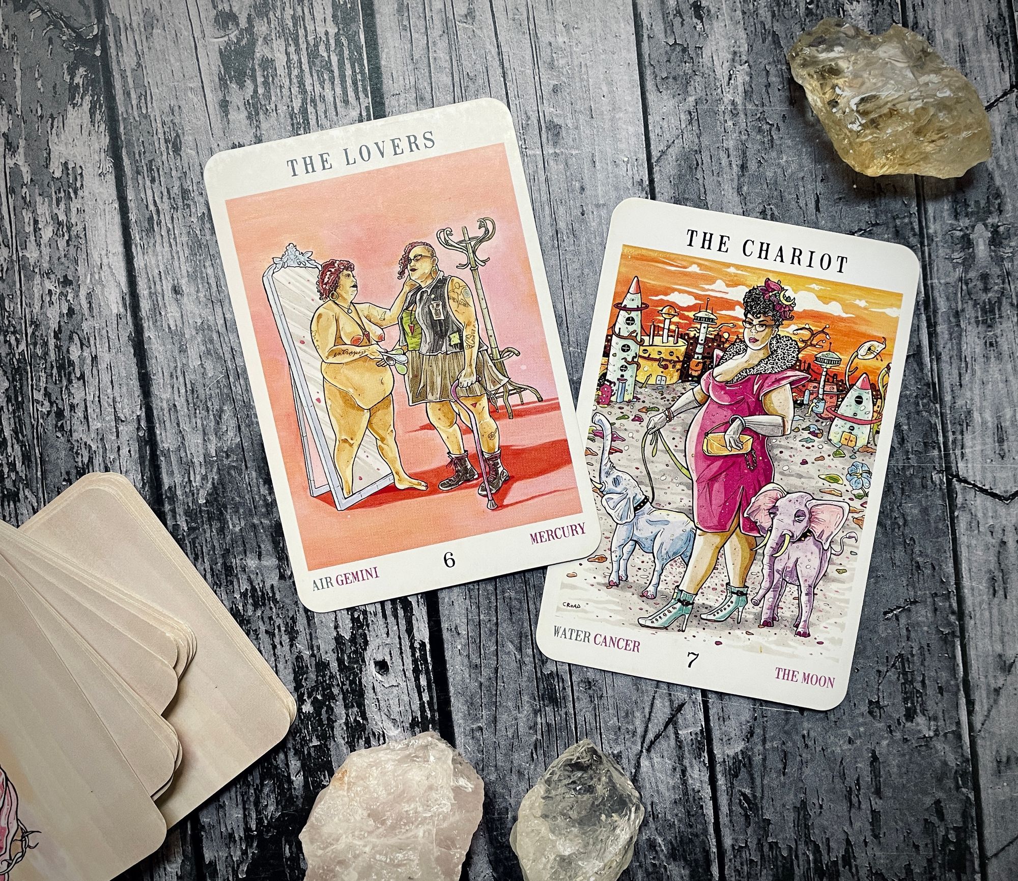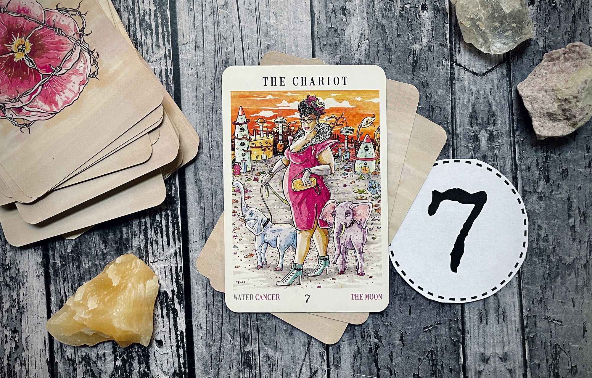 we tend to talk about the chariot in the same way that i describe pursuit: focused energy, determination, victory and power, achievement. this archetype, the last in the first line of the major arcana, represents a big accomplishment, a sense of fulfillment, stepping into our own. but the correspondences for the chariot, the cardinal water of the zodiac sign of cancer and the aching desire for understanding of the number 7, add so much depth to this archetype.