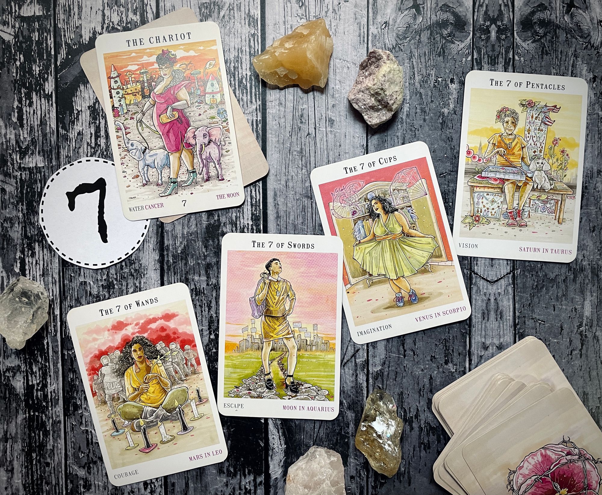 when the lovers and the nurturing joy of the 6 start to feel stifling, when the fool’s desire and cravings reveal themselves anew, we’re ready to move into a different archetype. we’re ready to embrace imagination, to dream bigger, to look beyond what we know and consider what we want to pursue. we’re ready to achieve the next milestone, and in doing so, break down some barriers.