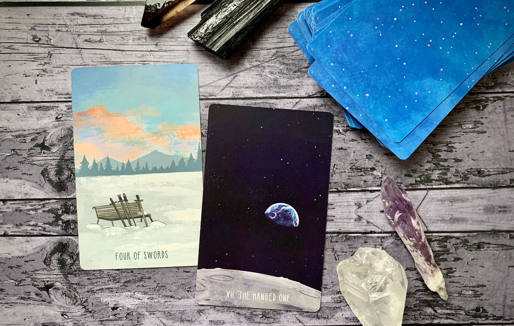 the tarot has a lot to say about rest. the first card that always comes to mind when i think on this theme is the four of swords, a card of mental boundaries and protection, of laying down our blades and prioritizing healing and restoration. on the heels of the three, a card of stinging betrayal and painful truths, the four urges us to step back from movement and instead give ourselves time to breathe and process, to set limits, to honor our needs. this card usually pops up for me when i feel like rest is the absolute last thing i have time for, yet its wisdom always rings true. in a similar way, the hanged one is an archetype of suspension and sacrifice, forcing us to look at the world from a new perspective, asking us what shift we are beginning and how we plan to move through it. the four of swords urges us to carve out time for quiet, but the hanged one doesn’t give us a choice, pulling our feet out from under us and compelling us to breathe into the discomfort, to learn to accommodate the change on the horizon. both cards push rest, whether we’re ready for it or not.