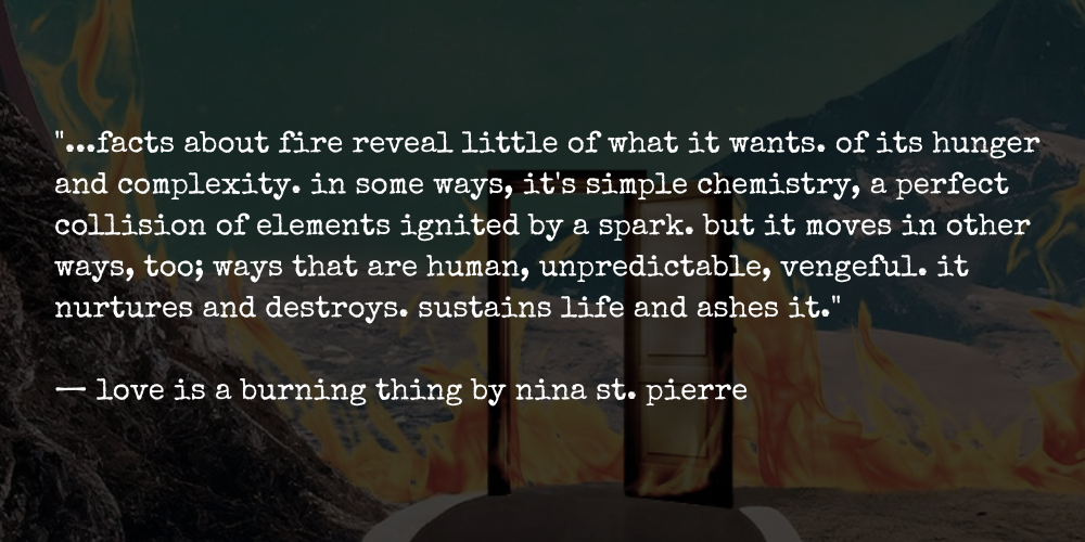 in her stunning debut memoir, love is a burning thing, nina st. pierre writes of her lifelong study of fire: its ability to sustain, to destroy, to transform, to bind and to sever. her story tangles with her mothers', a tale of ashes and desire and consumption, of surrendering to the hunger of the flames whether we mean to or not.