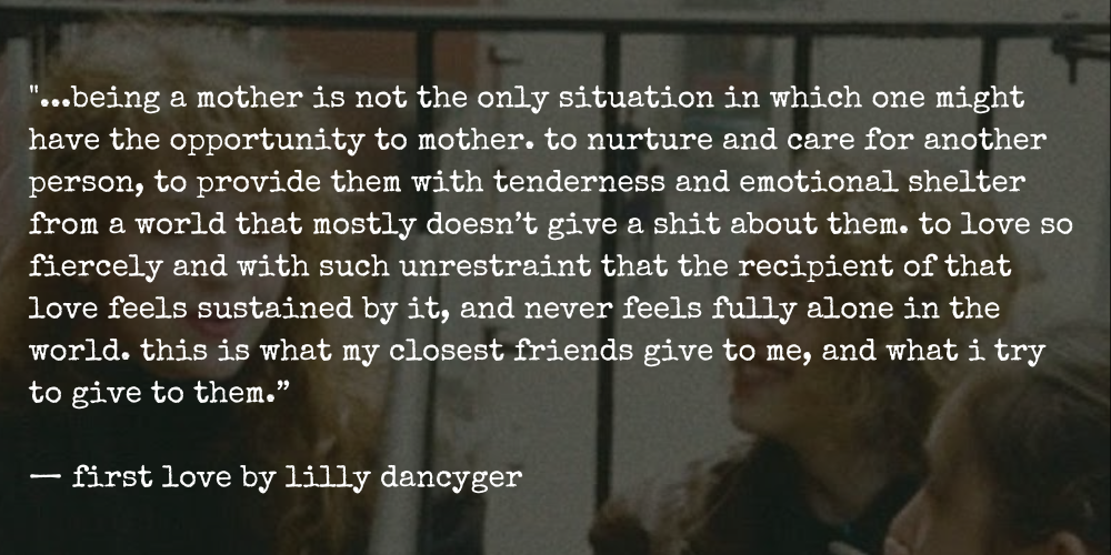in her latest brilliant work first love, a love letter to friendships and chosen families, lilly dancyger tugs on the threads of mothering and motherhood, on the ways that we care for one another, on the magic of being nurtured by those who have been rejected themselves. the reciprocity that comes from knowing that we take care of us. the love that flows when we build strong fires together instead of struggling with our own personal flame.
